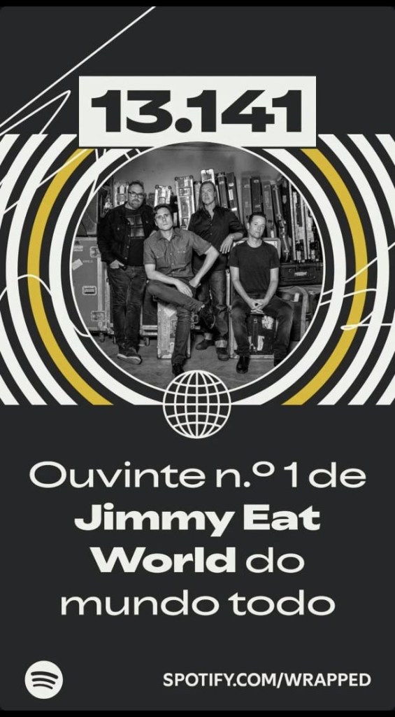 Este ano o Spotify Wrapped me surpreendeu, não pelo o que eu escuto, até porque eu já sabia bem o que viria, mas surpreso por saber que no mundo em 2025 eu fui a pessoa que mais escutou a banda Jimmy Eat World pelo Spotify. Espero que não seja mentira, porque fiquei bem feliz ao saber que um brasileiro foi o fã número 1 da banda, desmistificando assim que o Brasil só consome artistas nacionais, como já escutei de algumas pessoas ao longo da vida.